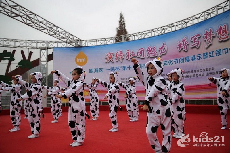 社团文化节的少先队员们献爱心 活动现场,区政府教育督导室副主任林友谊致辞,他充分肯定了近几年瓯海区学校社团取得的成绩,指出社团文化节全面生动展示了学生群体青春、活力、蓬勃向上的风采,并用“勤学”“实践”“创新”三个词就学校社团发展寄语希望。随后,红领巾公益基金仪式启动,呼吁参加社团文化节的少先队员们能够献出一份爱心,为需要帮助的伙伴们送去一份冬日里的温暖,瓯海区少工委将募捐到的善款捐赠到浙江省红领巾公益基金。各领导嘉宾为娄桥第二小学武动少年社团、瓯海区外国语学校陶笛乐园社团、丽岙华侨小学小神农的试验田社团、瓯海艺术实验小学彩泥坊社团等9个获得娄桥专场人气社团以及瞿溪华侨中学男子篮球社团、瓯海区实验中学心理素质拓展训练社团、三垟三小妙手生花社团、瓯海艺术学校合唱社团、仙岩第一小学GM创客社团等13个获得精品社团的学校颁奖。活动过程中穿插着各社团精彩的表演,新桥一小教育集团新桥校区的奶牛操、温州大学附属茶山实验小学的街舞、瓯海牛山实验小学的武术操、瓯海职业中专集团学校的模特表演等精彩节目,尽情展现社团魅力,赢得台下观众掌声阵阵。闭幕式精彩纷呈,结束后舞台两旁的社团展示更是热火朝天,吸引了大批新桥周边的居民参与其中。