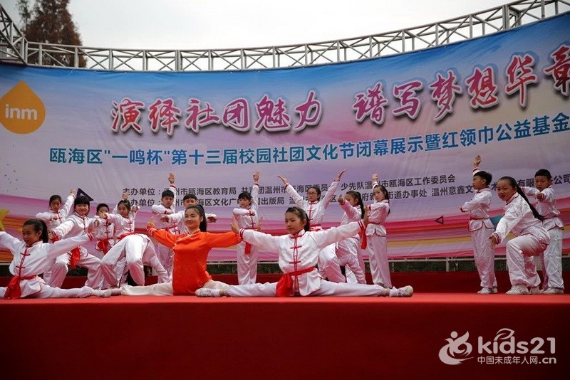 瓯海牛山实验小学的武术操 据悉,瓯海区“一鸣杯”中小学校园社团文化节自2005年开始举办,至今已举办了十三届,经过13年的历练和积淀,社团建设已经成为中小学校园文化建设的重要内容,被纳入学校课程建设体系,本届文化节系列活动自11月份启动,全区各校按照有关要求,认真组织发动学生社团积极参与以“演绎社团魅力·谱写梦想华章”为主题的文化节系列活动,充分发挥青少年社团在推进校园文化建设、促进青少年全面发展等方面的重要作用,展现了瓯海区新时代中小学生的精神风貌和综合素质。(温州市瓯海区文明办)