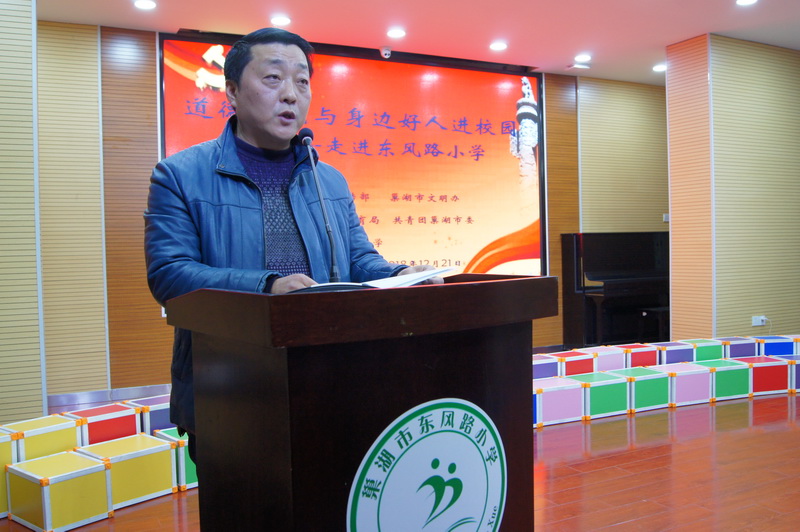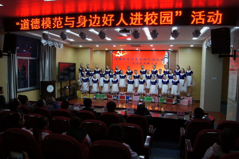 参赛人员合影 下午3点半,活动正式拉开帷幕。伴随着古典韵律:《水调歌头明月几时有》《陋室铭》《诫子书》《唱响中国梦》《青春万岁》《我的南方和北方》……一篇篇经典名篇,经过学生吟诵与演绎,将古典诗词与音乐融为一体,达到了文学与艺术、传承与发展的完美统一。比赛活动在学生们抑扬顿挫、慷慨激昂、声情并茂的诵读声中一次次被推向了高潮,全场不时报以热烈的掌声。 用经典浸润心灵,让阅读丰富人生。本次活动,让同学们在诵读中领悟了经典美文的魅力,体验了心灵深处的激情,激发了他们热爱祖国、珍惜生活、热爱优秀文化的情感。同时也提升学生的人格品位,增强他们的道德素质与审美品质。 传递榜样力量 道德模范与身边好人进走进东风路小学 为大力宣传道德模范先进事迹,大力弘扬社会正气,进一步加强道德模范、身边好人、师德楷模、新时代好少年等先进典型的学习宣传,提高广大教师和学生思想道德素质,在学校营造“学模范、做模范”的舆论氛围,近日,巢湖市东风路小学开展“道德模范与身边好人进校园”活动。