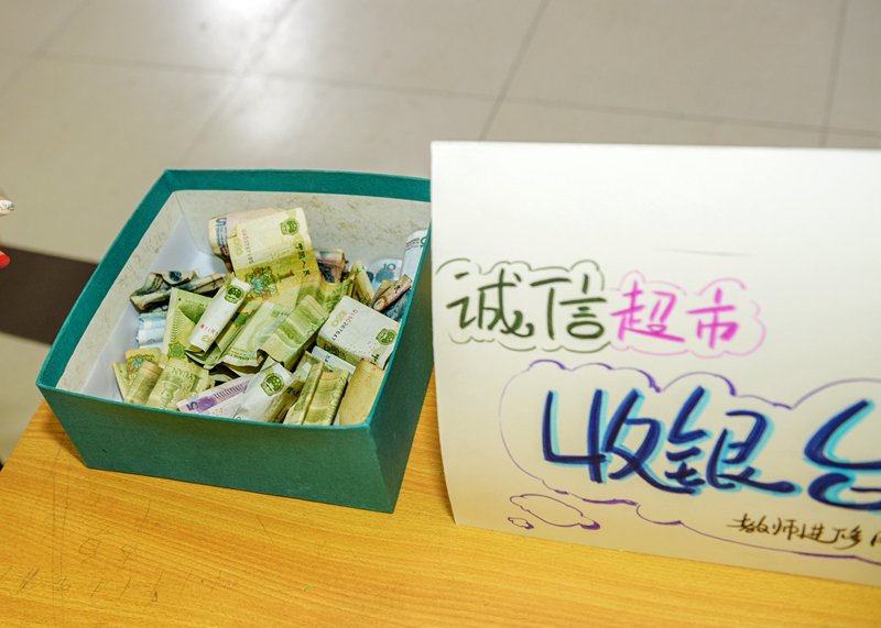 诚信超市里不设收银员,付款全靠孩子们的诚信自觉与相互督促。
