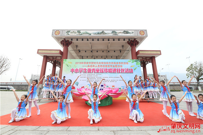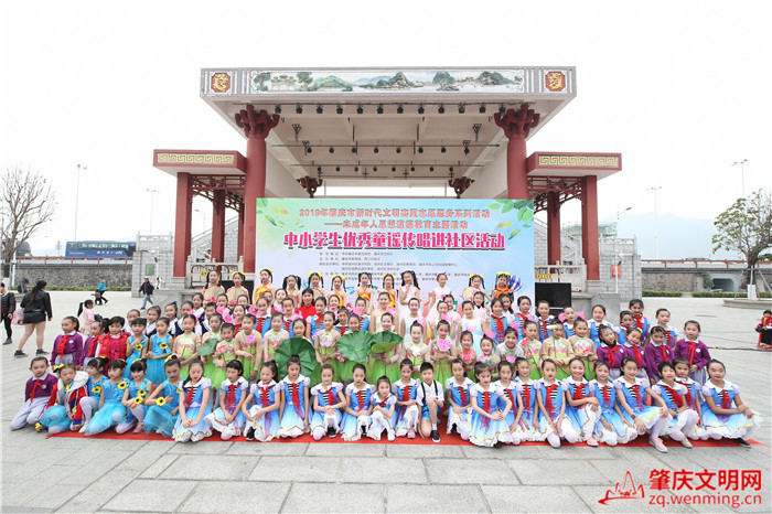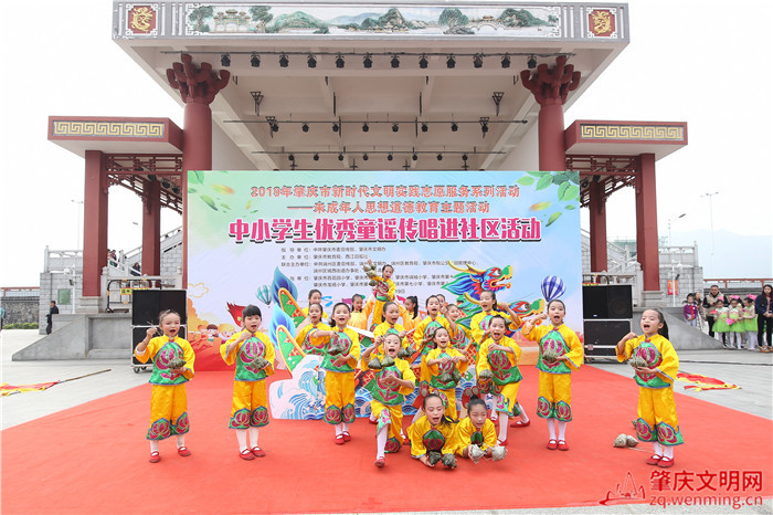 “中小学生优秀童谣传唱进社区活动”现场。陈庆卫摄 1月19日上午,“中小学生优秀童谣传唱进社区活动”在肇庆市包公文化园广场举行,青少年们在这里纵情放声,以童谣为行为标尺,传递尊敬师长、孝顺父母、文明礼貌、诚实守信、互帮互助等精神内涵,达到学习礼仪知识,养成文明礼仪的好习惯。