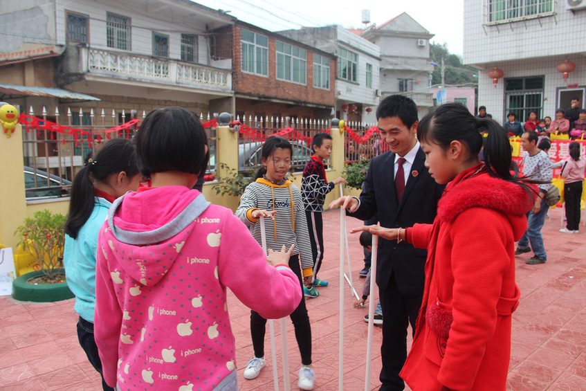 工作人员与孩子们游戏 仪式后,工作人员们还为孩子们准备了形式多样的活动:区法院、检察院的志愿者为孩子们进行禁毒、校园防欺凌和交通安全等法制宣传,增强他们的安全防范意识;莆田华侨医院的医生们为孩子们进行免费健康检查;助涵社工们带着孩子们进行安全知识有奖竞答和猜灯谜活动,现场格外热闹。 参加活动的孩子们纷纷表示要努力学习,以优异的成绩回报社会,争当新时代的好少年。今后,该基地将继续不定期开展活动,提高孩子们的自护自救能力,呵护农村留守儿童健康成长。(张群英) |