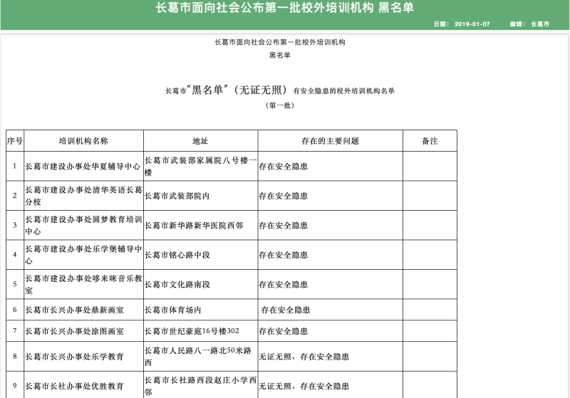 教育部要求各地加快“全国中小学生校外培训机构管理服务平台”的信息录入工作,方便社会查询和监督。记者查看该平台发现,全国多地已公布校外培训机构黑、白名单,其中黑名单约40条,每条公布的机构数量从几家至百余家不等。 据悉,中小学生校外培训机构管理服务平台(网址为https://xwpx.emis.edu.cn)已于去年12月上线,全国统一,集规范、监管、举报、服务于一体。从上线起,全国各地的县、区陆续在该平台面向社会公布校外培训机构黑、白名单等,截至1月16日,在该平台的“曝光台”、“动态信息”等栏目中,共有黑、白名单信息近300条,其中黑名单约40条,每条包含的机构数量从几家到上百家不等。 已公布的黑名单中,河南许昌长葛市第一批校外培训机构黑名单显示,位于长葛市长社路西段赵庄小学西邻的优胜教育等机构无证无照、存在安全隐患等;安徽六安市裕安区校外培训机构黑名单(第一批)显示,位于凯旋观邸10楼的昂立英语办学场所处于高层,存在重大安全隐患;此外,安徽省淮北市相山区第一批校外培训机构黑名单中,位于一中东门石油公司楼上5楼的星火教育、海容广场16楼的安博教育咨询有限公司等上榜。 记者发现,各地黑名单上的机构既包括学科辅导类机构,也有大量为文体艺术类培训机构,绝大部分为规模小、知名度低的小机构。不合格的原因大部分为证照不齐全、存在安全隐患、无消防通道等。这些机构按照各地相关部门要求被关停整改或取缔。 各地名单分批次公布,例如浙江省义乌市的白名单已公布至第二十批,金华市金东区白名单已公布至第七批。且多地的黑白名单均实施动态管理,将不定期进行更新。 此外,该平台“校外培训机构查询”“网上投诉”功能已经开通,“校外培训机构排查登记”功能需注册账户后方可登录,“学生学科类校外培训情况登记”“校外培训机构注册”功能仍在开发中。