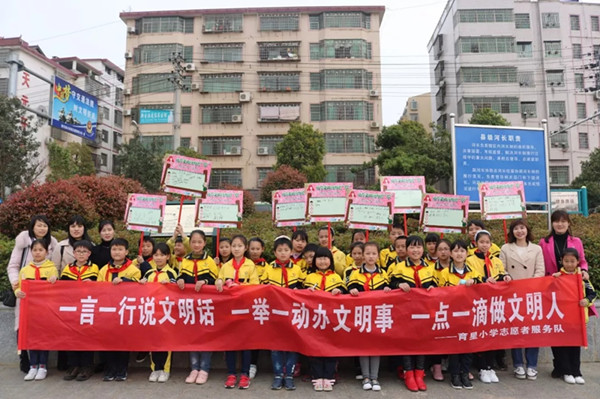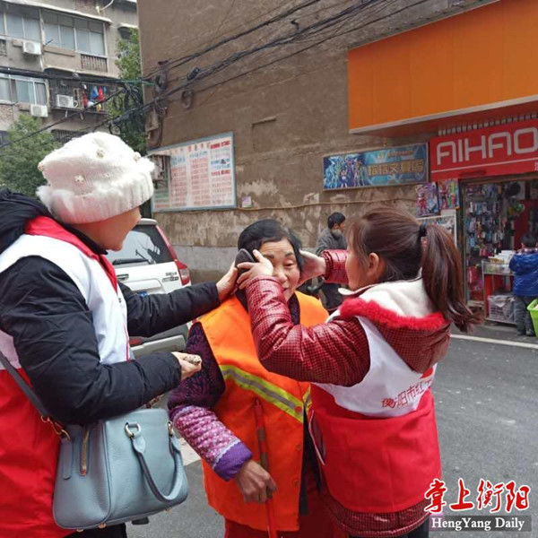 给环卫阿姨戴上耳罩。 红十字会小小志愿者们一路为在街头打扫的环卫工人们送去了手套、耳罩等御寒物品并给他们发放应急救护培训手册和宣传袋。同时他们为演武坪社区、珠晖社区、红湘社区居民送去急救知识手册。活动当天,共发放应急救护宣传知识手册1500余份,送出手套、耳罩30余副。 “我是小小文明劝导员” 为大力弘扬“奉献、友爱、互助、进步”的志愿服务精神,树立青少年的主人翁意识,衡阳市石鼓区成龙成章小学组织小小志愿者到西湖二村社区开展“文明劝导”活动,为文明创建贡献一份力量。