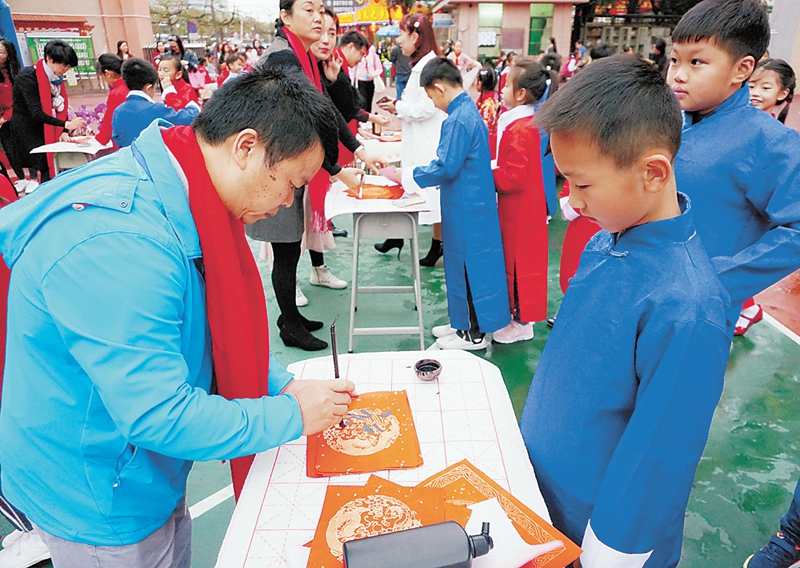 十六小举行剪窗花、写书法、赏兰花,在传统中开学。朱习摄 有新意:校长挥毫送“福” 学生喜领“红包” 2月18日,珠海各大中小学迎来开学季。珠海市香洲区第十六小学的校园内,处处张灯结彩。尽管“天公不作美”,但阴雨中回到学校的学生们,个个朝气蓬勃、精神抖擞。一进门,身着传统服饰的家长和孩子们站在校门两侧,共同迎接平安返校的师生们,并向他们拱手行礼,把新年的祝福送给大家。现场最吸引人眼球的莫过于正在挥毫泼墨的该校校长严文桂了,这位“大朋友”将现场书写的“福”字送给孩子们,祝愿他们在新的一年节节高升、福气满天。老师和家长们也都现场书写了“吉祥”“美满”“进步”等祝福话语送给孩子们。“希望用这样的方式将传统文化的精髓融入到教学行动中,让师生们感受到十六小就是我们的大家庭,我们要像一家人一样和和美美。”严文桂说。 珠海新世纪学校的开学第一课同样充满新意。各班班主任当天为学生们准备了丰厚的礼物——新年“红包”,但这个红包有点特别,红包里面没有钱,而是一张满是心意的红纸条。纸条上的内容各不相同,如“犯小错的时候请老师给予一个微笑”“根据自己的喜好换一次座位”“跟喜欢的老师或者同学玩一次游戏”“奖励周五和自己喜欢的老师共进午餐一次”“由校长亲自接待,参观校长办公室、行政楼一次”“免写一次家庭作业”等。该校相关负责人表示,这种形式改变了学校多年来开学第一课的模式和内容,无形中在校园内构建起家庭式的亲情关系,让孩子们感受到学校如家一般的温馨。