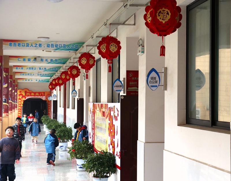 每层楼教室走廊外挂满了五颜六色、各式各样的灯笼,学生们奔跑在各个教室之间,整个校园洋溢着喜气洋洋的氛围。龙莉摄