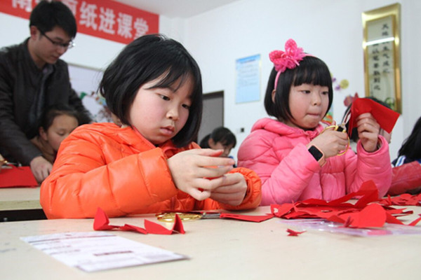 初次接触剪纸的孩子们,兴趣盎然地用剪刀剪出多彩的童年。 剪纸课堂上乐趣横生,惊喜不断。“南岳剪纸”非遗传承人肖焕耐心讲解如何设计、折纸及画图,并手把手教孩子们剪出自己喜爱的花样。“这是我剪的花花,蜜蜂和蝴蝶会来采花蜜!”初次接触剪纸的孩子们,兴趣盎然地用剪刀剪出多彩的童年。