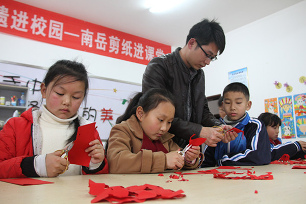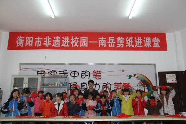 3月13日,在衡阳非遗进校园—南岳区金月完小剪纸课堂上,“南岳剪纸”非遗传承人肖焕手把手教孩子们剪出自己喜爱的花样。 “肖老师您看!我剪的蝴蝶多美!”3月13日,在衡阳非遗进校园—南岳区金月完小剪纸课堂上,四年级学生陈陈向大家展示自己的剪纸作品。