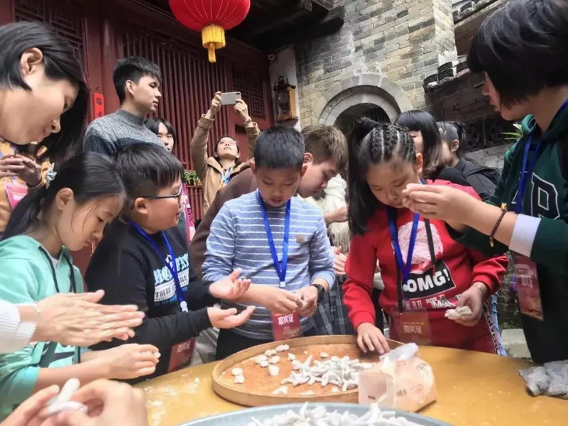 香港青少年们在永定湖坑振成楼做永定客家美食芋子粄 全体团员在闽西期间先后参观了世界著名的永定区高北土楼群、家风楼(振福楼)、洪坑土楼民俗文化村、客家家训馆,参观了上杭客家族谱馆、连城培田古村落、长汀历史文化名城等,博大精深的客家文化让人叹为观止。除夕,全体团员在永定侨福楼与当地居民一起做过年准备工作,包括大扫除、做年糕、写春联、贴春联,欢欢喜喜一起吃年夜饭。大年初一,全体团员按客家习俗给当地居民拜年,欣赏客家土楼舞龙、五色锣鼓和斗笠舞、筷子舞等表演;当晚在振福楼(家风楼)门坪自编自导一场新春文艺联欢晚会,竹板歌、客家山歌、客家童谣、客家小调、客家民乐等饶有趣味的节目,把过大年活动推向高潮。