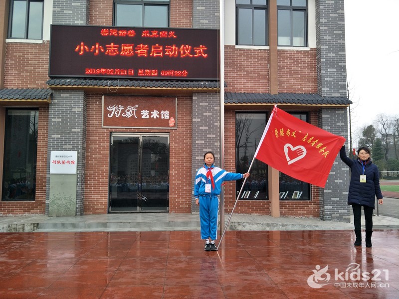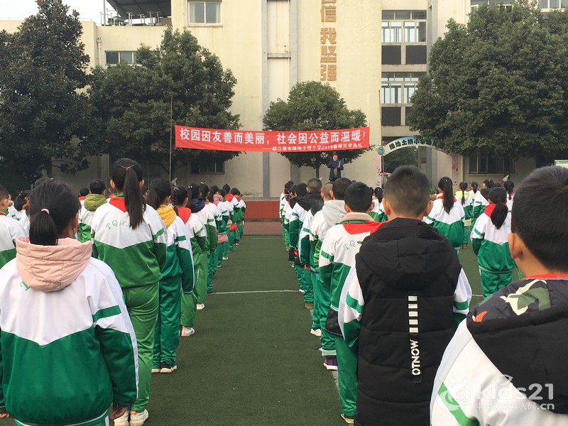 崇义小学为乐于奉献“小小志愿者”授旗。 绿地土桥小学以“校园因友善而美丽,社会因公益而温暖”举行了2019年春季开学典礼。