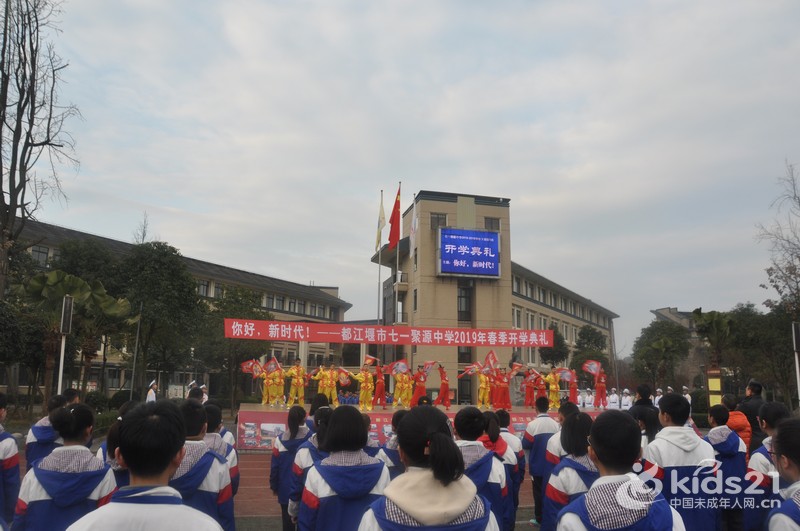 典礼现场,七一聚源中学组织了特色节目表演,迎接新学期的到来 2月21日,北街小学永丰校区结合“天府文化”,举行了“飞扬的蒲公英 飞扬的梦想”开学主题教育活动。