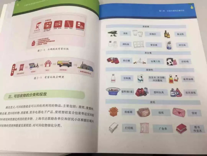《上海市生活垃圾分类知识读本》(中学生版) 《上海市生活垃圾分类知识读本》(中学生版)在小学生版的基础上,增加了“湿垃圾优先分类的意义”“发达国家垃圾分类的先进做法”“国家和地方近年来对垃圾分类的相关法律法规”等内容,让中学生从更深层次理解垃圾分类的环境可持续发展意义和社会文明进步意义。 据华师大出版社介绍,该套丛书主要由上海市绿化市容管理局、华东师范大学共同编写,上海市人大城建环保委、市教委、团市委、市文明办、长宁少科站、华师大附小的多位专家对初稿进行了审读及讨论。(梁佳) 以下为部分内页:
