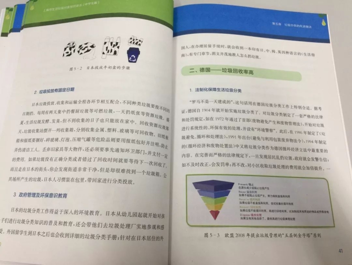 2018年12月5日,上海市绿化市容局、市教委和华东师范大学联合发布了上海首套全市统一的《上海市生活垃圾分类知识读本》。为适应不同年龄段学生的认知水平和阅读习惯,华东师范大学出版社日前推出的这套《上海市生活垃圾分类知识读本》分为三册——幼儿园版、小学生版、中学生版,有针对性地进行垃圾分类知识的科普。 该系列读本是目前全国首套正式出版的、由高校和政府实务部门合作编写的学校生活垃圾分类读物之一。该套读本的特色可以概括为“一个理念”和“三大亮点”。“一个理念”为秉承“垃圾分类要从娃娃抓起”理念,强化国民教育的基础性作用。“三大亮点”为:(1)立足不同年龄阶段,提高针对性;(2)专业知识学习和实践能力培养并重,强调指导性;(3)对标国际标准、体现上海特色,凸显专业性。