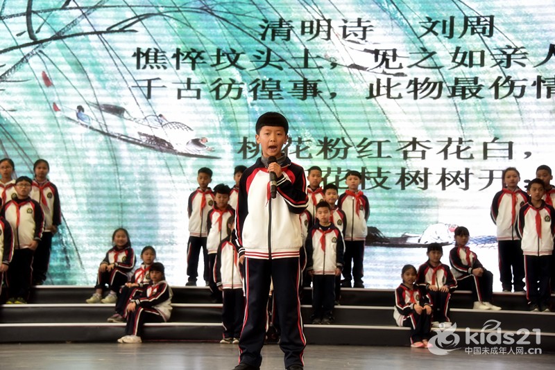 深情朗诵诗歌 活动中,孩子们讲述了清明的来历、清明的习俗,让大家知道了清明不仅是春天踏青的日子,更有值得铭记的历史故事。文艺表演环节中,快板声响起,整齐有气势,寄托了孩子们对先烈的崇敬之情,也表达了对先烈的缅怀之意;一曲《魅力育英》,让孩子们在舞蹈中尽情绽放个性,大家许下美好的愿望,表达对革命先烈的无限思念,还有精彩的诗配乐朗诵,仿佛把大家带回了历史的洪流……精彩的节目把本次活动推上了高潮,赢得了现场师生的阵阵掌声。此次活动还邀请了学生家长代表介绍清明饼的做法,最后,活动在合唱《清明》中结束。通过活动的开展,同学们备受感染,增强了热爱祖国、热爱人民、热爱中华民族的情感,孩子们纷纷立志为实现中华民族伟大复兴的“中国梦”而努力学习。